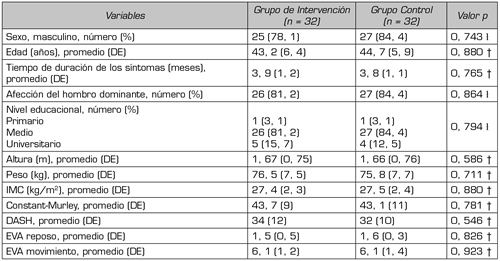 Las variables cuantitativas se presentan como promedio y DE, y las cualitativas como número y porcentaje, para determinar los test estadísticos a utilizar en el análisis de los datos primero se evaluó la distribución normal con el test Shapiro-Wilk. Para comparar los datos basales iniciales de las variables género, afección del hombro dominante y nivel educacional se usó el test Chi cuadrado, para el resto de las variables cuantitativas se usó el test de student.
