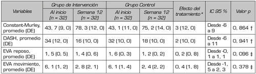 En la Tabla 3 se muestran los valores iniciales y finales en cada grupo de estudio, y el efecto del tratamiento, vale decir la comparación de los valores entre ambos grupos al finalizar la duodécima semana. Al comparar los resultados entre ambos tratamientos al finalizar la 12.ª semana, el cuestionario Constant-Murley muestra una diferencia de 3 puntos (p = 0,864) y el cuestionario DASH una diferencia fue de 2 puntos (p = 0,941), ambas diferencias son a favor del grupo de intervención, pero sin diferencias clínicas ni estadísticamente significativas. En el caso de la EVA en reposo la diferencia fue de 0,2 cm (p = 0,096) y la EVA al movimiento fue de 0,4 cm (p = 0,378), en ambas variables la diferencia en la reducción del dolor fue mayor en el grupo control, pero tampoco fue estadísticamente significativa (Figuras 3 a 6).