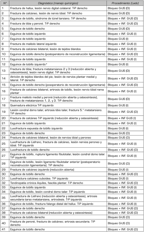 T-P: tobillo-pie. d: lado derecho. i: lado izquierdo. g-us: procedimiento guiado por ultrasonido. inf: infiltración. *paciente con edema local posterior al bloqueo. G-US [D]: procedimiento grado por ultrasonido, lado derecho. G- US inf. [D], infiltración guiada por ultrasonido, lado derecho.