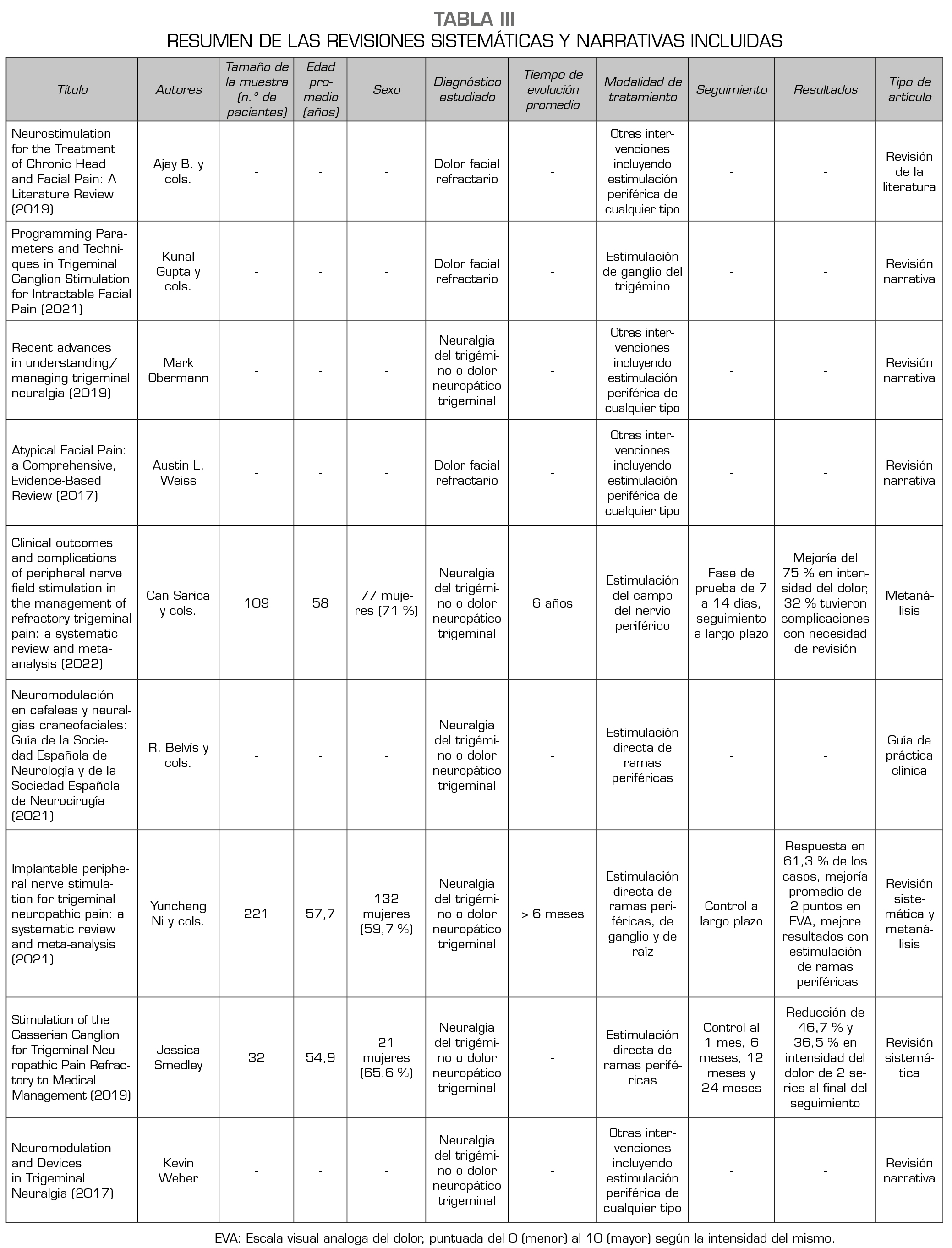 Las revisiones sistemáticas y narrativas sobre el tema, resumidas en la Tabla III, brindan un mejor panorama sobre la relevancia de la intervención con estimulación eléctrica continua en la neuralgia del trigémino. Aquellas que intentan brindar datos puntuales son escasas y desafortunadamente no son concluyentes. La pobre calidad y cantidad de la evidencia que utilizan como sustrato podría ser la responsable. Las más grandes de este tipo son las realizadas por los equipos de Yuncheng en 2021 y Sarica en 2022; su interpretabilidad conjunta es limitada por los mismos problemas de heterogeneidad que tienen a los trabajos originales, sin embargo parecen indicar que la respuesta inicial al manejo con esta intervención es bueno, con un posible decremento en la efectividad a medida que continúa el seguimiento y una tasa de complicaciones variable, pero de naturaleza grave cuando se presentan.