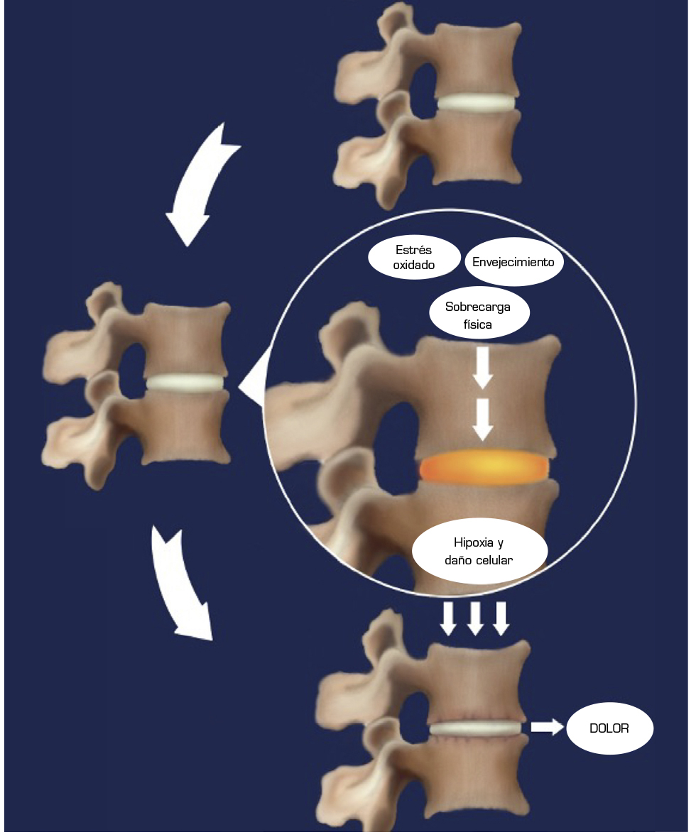 A pesar de ser una estructura anatómica simple, en el disco intervertebral suceden cambios de envejecimiento que son los que inician las modificaciones biomecánicas que se reflejan directamente en los síntomas dolorosos. Es esencial en ese proceso patológico la pérdida de la estructura y la modificación del núcleo, el anillo y la matriz extracelular. Ese cambio en la estructura es producido por la pérdida de equilibrio en los procesos anabólicos y catabólicos, manifestado con la disminución en los nutrientes y la acumulación de los productos de desecho. Enzimas catalizadoras como las proteinasas se liberan por las células del disco y producen descomposición de la matriz celular. Los procesos de apoptosis y muerte celular empeoran la evolución con la pérdida de las células madres derivadas del NP, pérdida de proteoglicanos, glucosaminoglicanos y la estructura de la matriz extracelular.