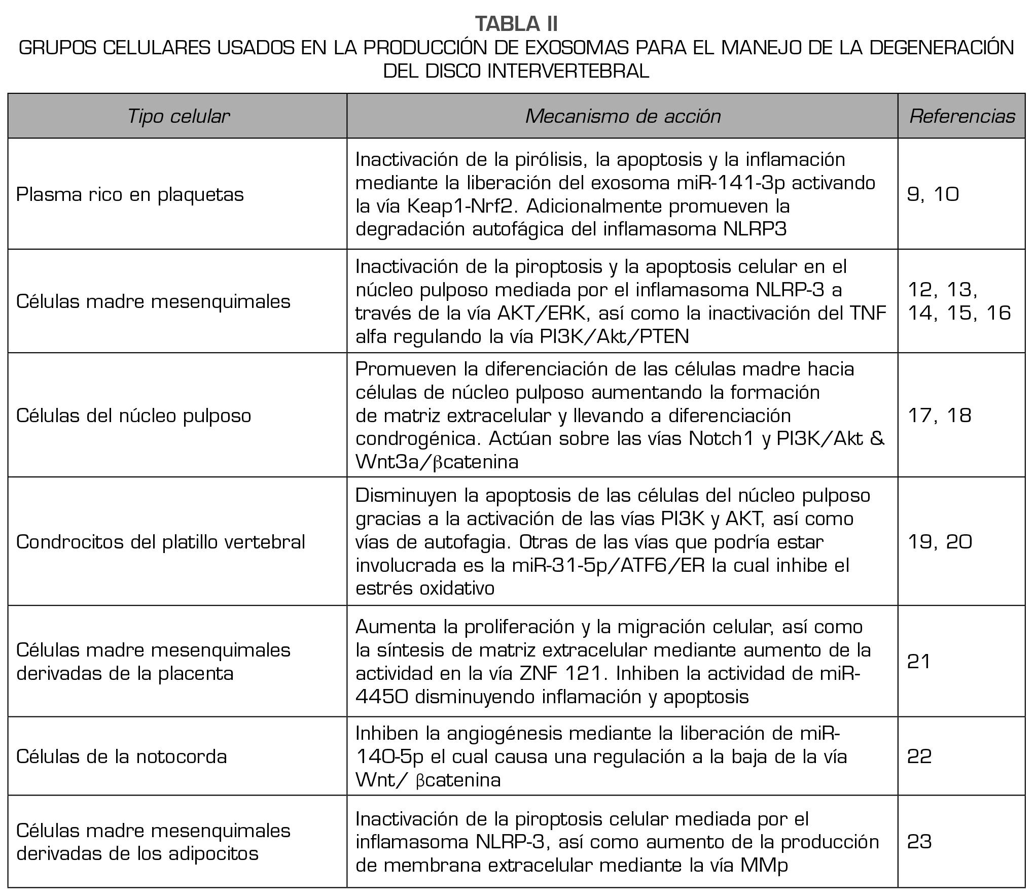La siguiente tabla evidencia las diferentes cascadas de señalización asociadas a células correspondientes, así como los estudios experimentales donde se pusieron a prueba los distintos métodos (Tabla II). A pesar de la utilidad biológica demostrada en los estudios experimentales, solo se ha realizado un ensayo experimental llevado a cabo en la India, en donde 22 pacientes con dolor lumbar discogénico fueron sometidos a una única inyección intradiscal de plasma rico en plaquetas en uno o múltiples niveles, los resultados preliminares en los seis primeros meses de seguimiento fueron alentadores(26). A pesar de que este artículo no habla específicamente de los exosomas, se evidencia cómo el uso de este compuesto podría tener resultados prometedoresSin embargo, es necesario realizar ensayos clínicos aleatorizados para comprobar la efectividad real.