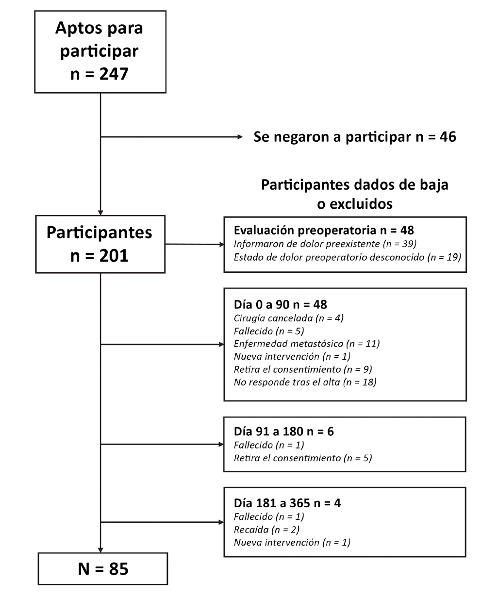 Se reclutó a 211 pacientes y se excluyó a 39 (19,4 %) debido al dolor preoperatorio declarado y a 19 (9,5 %) debido a que se desconocía el estado del dolor preoperatorio. Un total de 85 pacientes (42 %) siguieron respondiendo durante el seguimientoy se incluyeron en los análisis finales. En la Figura 1 se presenta un diagrama de flujo de la muestra del estudio.
