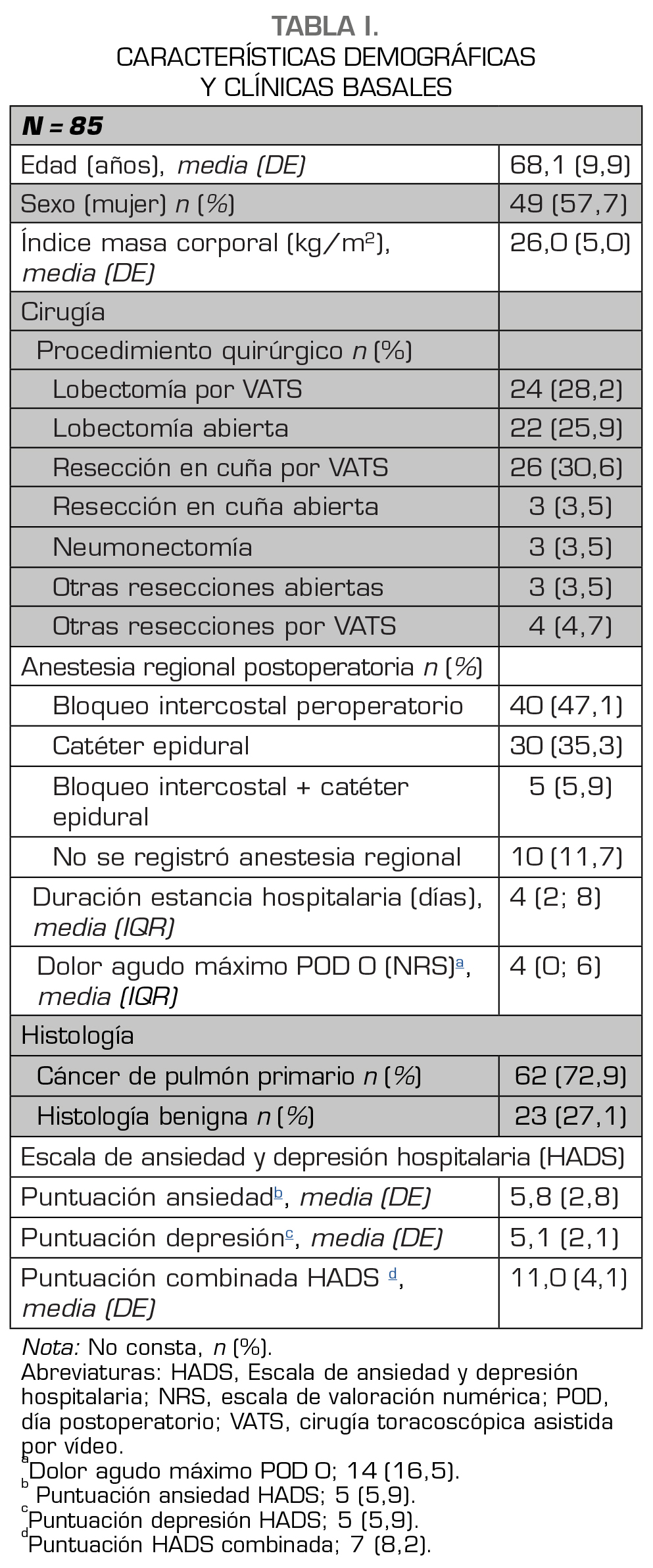 Los datos demográficos, el tipo de intervención quirúrgica y el abordaje mediante toracotomía anterolateral o VATS (cirugía toracoscópica asistida por vídeo), la anestesia regional y la histología tumoral se extrajeron de los historiales médicos electrónicos.