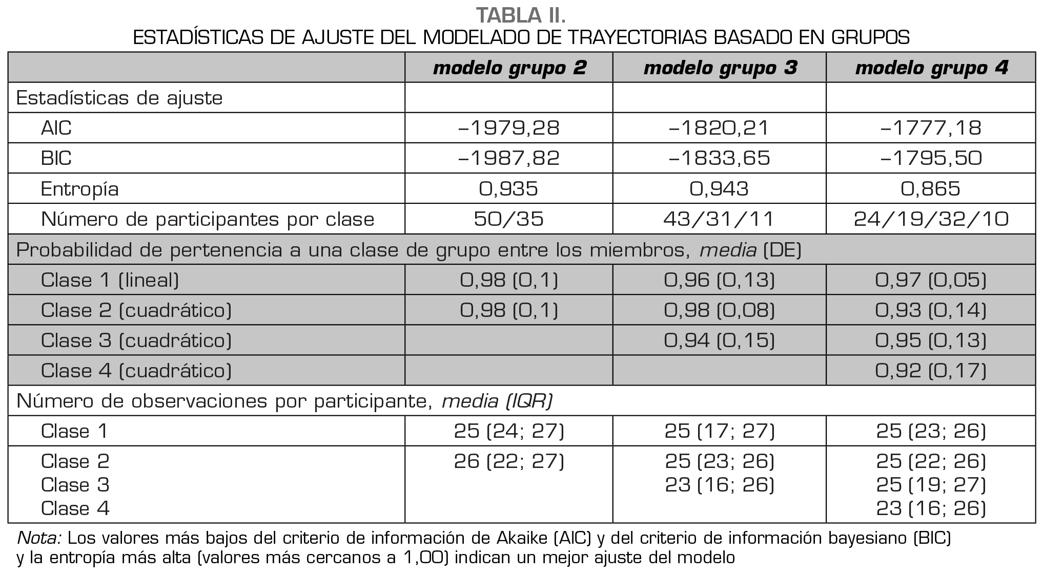 Se utilizó la modelización de trayectorias múltiples para calcular trayectorias basadas en datos múltiples en lugar de utilizar grupos preespecificados (29). El modelado de trayectorias múltiples es un método para el modelado de trayectorias basado en grupos (GBTM) y se realizó utilizando STATA versión 16.1 (StataCorp) con el paquete traj (29,30). Se investigaron tres modelos normales censurados, utilizando de dos a cuatro gráficos de trayectoria de la intensidad del dolor con diferentes términos de orden lineal a cúbico. Los modelos se evaluaron mediante el criterio de información bayesiano (BIC) y el criterio de información de Akaike (AIC), donde los valores más bajos representan un mejor ajuste del modelo. Las clasificaciones de grupos dentro de cada modelo se evaluaron mediante tres valoraciones: la probabilidad media de pertenencia a un grupo, la valoración gráfica de las curvas de trayectoria y la entropía, que denota la separación entre clases y grupos, donde los valores más próximos a 0 indican una separación deficiente y un valor de 1 significa una separación óptima. En la evaluación de los modelos se aplicó el principio de parsimonia, favoreciendo el modelo más sencillo sin pérdida de información clínicamente relevante. La selección final del modelo se basó en la evaluación estadística del ajuste del modelo, la mediana del número de observaciones en cada grupo, la evaluación gráfica y la aplicación clínica con respecto a las intensidades de dolor entre los grupos (31).