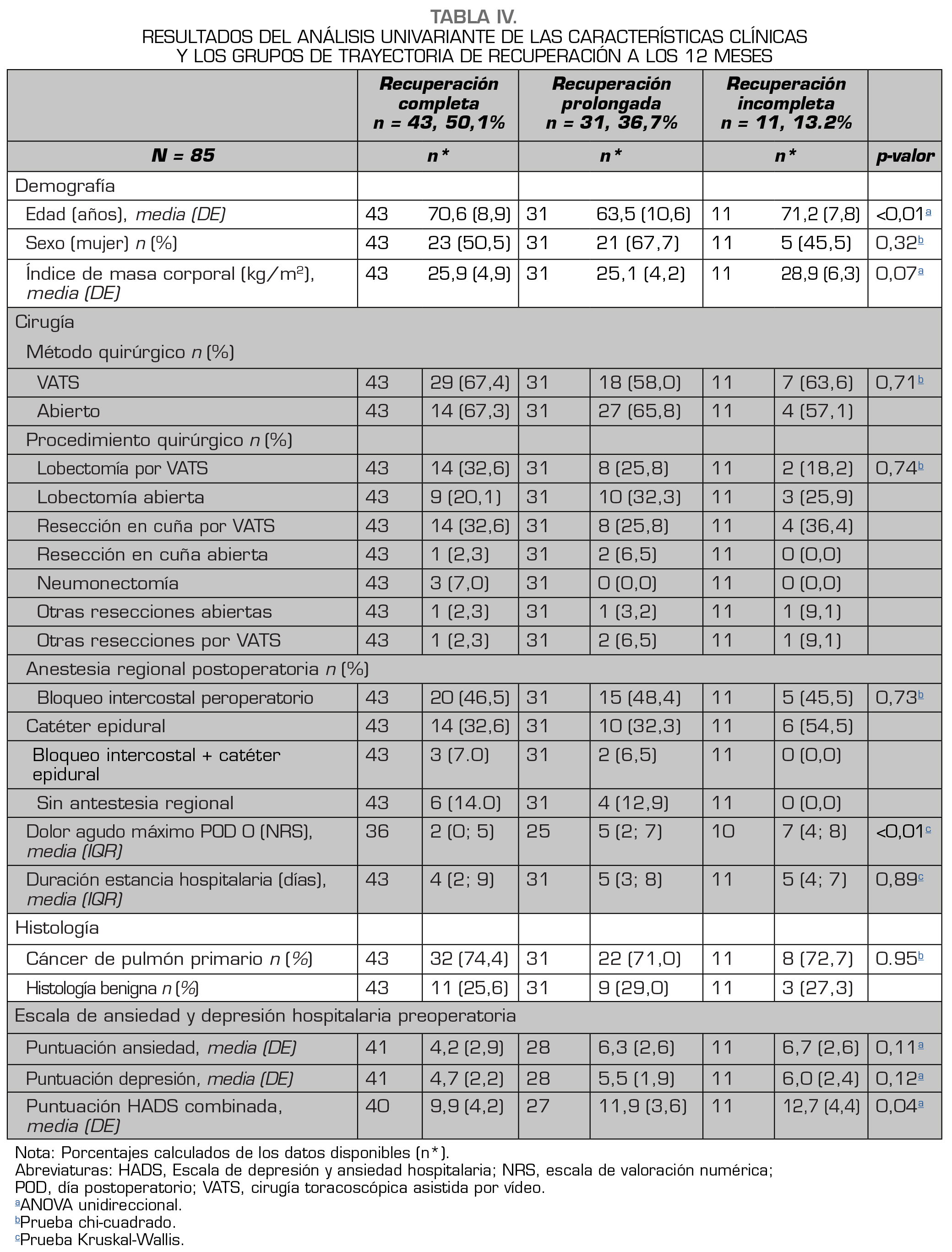 El dolor postoperatorio agudo máximo también se asoció significativamente con una trayectoria menos favorable de recuperación del dolor a los 12 meses (χ2 = 12,47, p < 0,01) (Tabla IV). Más de la mitad del grupo de recuperación incompleta (54,6 %) recibió un catéter epidural, pero no hubo diferencias significativas en la anestesia regional (p = 0,73) y el abordaje quirúrgico (p = 0,74) entre y dentro de los grupos (Tabla S3 en material suplementario).