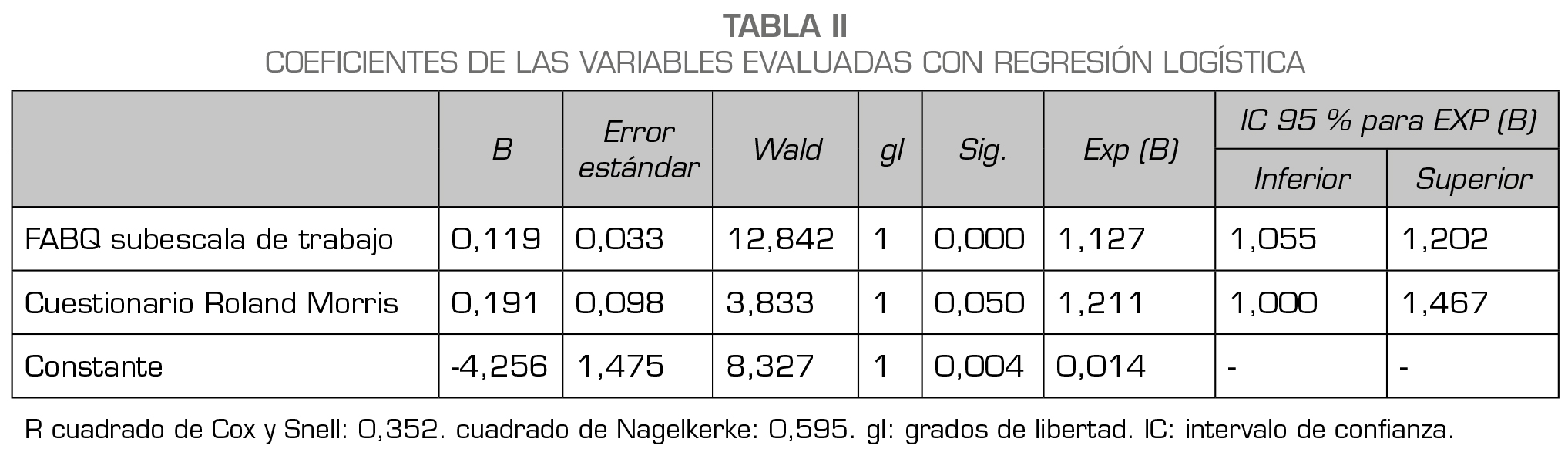 El ajuste del modelo de regresión logística binomial indicó que el mejor modelo fue aquel que contiene las variables explicativas: creencias miedo-evitación con el trabajo y discapacidad (probabilidad asociada = 0,135). El modelo de regresión logística binomial (Tabla 2) resultó ser significativamente confiable (x2= 36,835; p = 0,000). Además, el modelo explicó entre un 35,2 % y 59,5 % de la varianza de la variable RPS, según las pruebas de Cox & Snell y Nagelkerke, respectivamente. El modelo pronosticó correctamente el 71,4 % de los casos sin RPS y el 98,6 % de los casos con RPS. Los resultados del modelo indicaron que existe una asociación positiva entre las creencias miedo-evitación asociadas al trabajo y la discapacidad. Las razones de Odds indicaron que a mayor discapacidad (OR = 1,21; IC 95 % = 1,00-1,47) y creencias miedo-evitación asociadas al trabajo (OR = 1,13; IC 95 % = 1,06-1,20) la probabilidad de RPS es mayor.