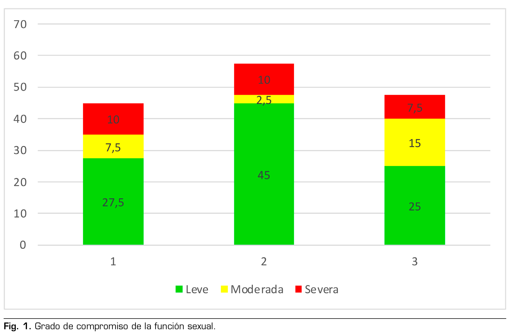 Para las personas esta población afectada, se determinó el grado de compromiso en la función sexual global y para cada uno de los factores que se presenta en la Figura 1.