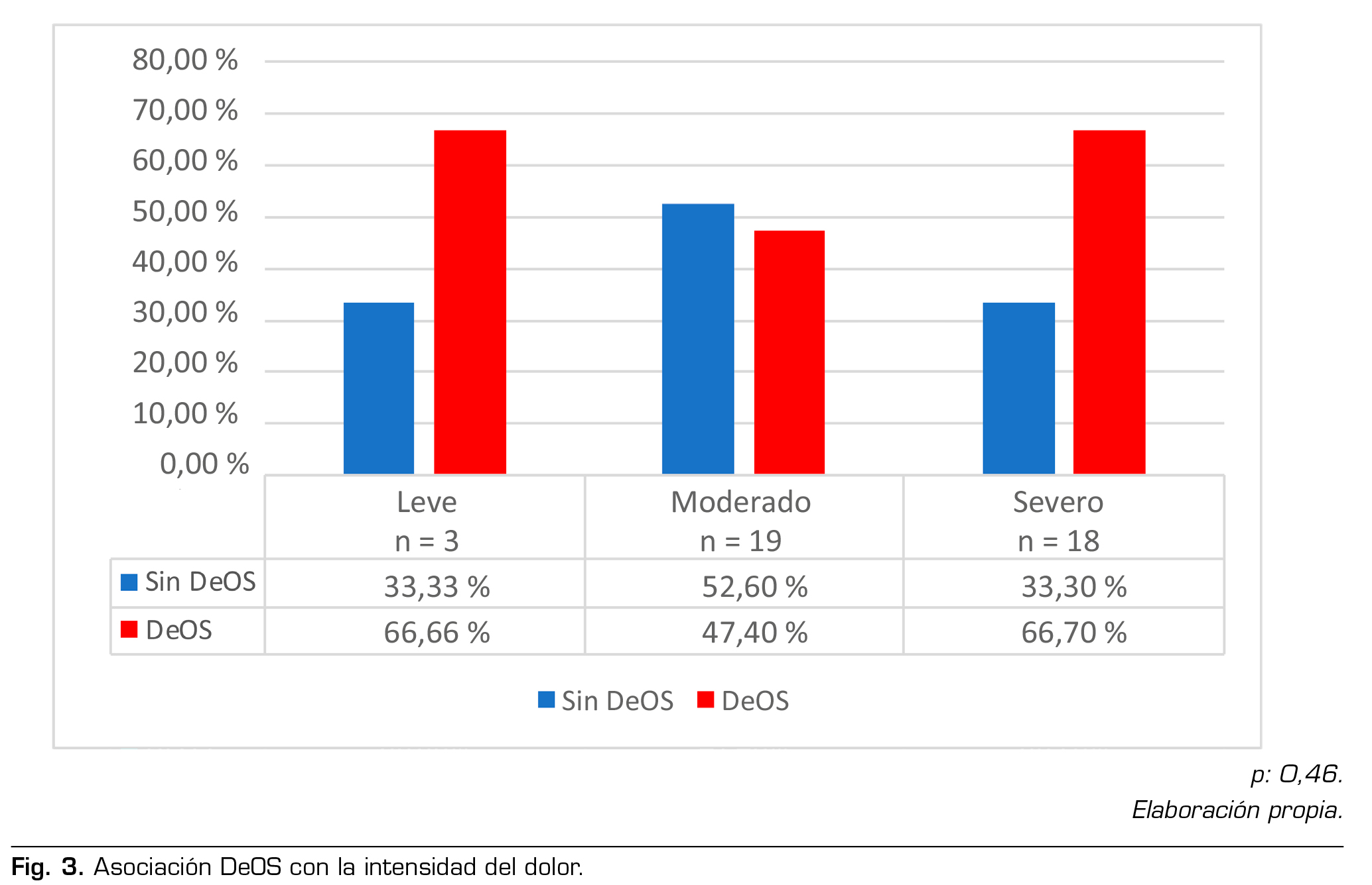 Se realizaron algunas pruebas de asociación libre, las cuales por el tamaño de muestra pequeño no son estadísticamente significativas, pero muestran tendencias de asociación. A saber, asociación de DeOS de acuerdo con el tiempo con presencia de dolor se refleja en la Figura 2; la asociación de DeOS con la intensidad del dolor se encuentra en la Figura 3. Finalmente, la asociación entre presencia de DeOS y bajo deseo sexual con el uso de los 3 medicamentos utilizados con mayor frecuencia, en la Figura 4 y 5, respectivamente.