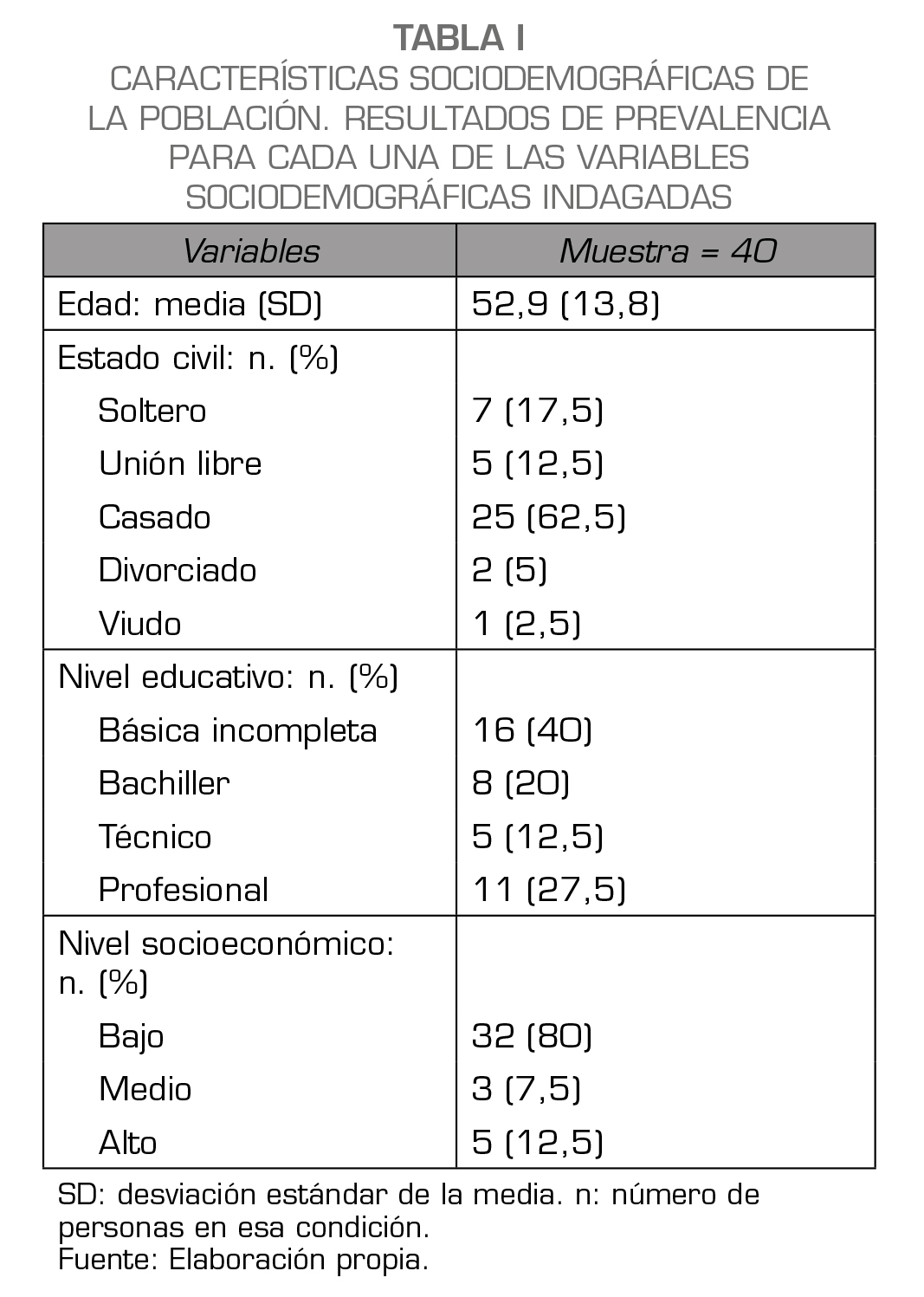 La muestra total fue de 40 pacientes, de los cuales 3 pertenecían a la Clínica Psiquiátrica San Juan de Dios CSJD y 37 al Instituto Caldense de Medicina del Dolor Icalmed. Se tomaron diferentes variables sociodemográficas, las cuales se presentan en la Tabla 1. El 85 % de los participantes referían tener una pareja sentimental estable en el momento de diligenciar la encuesta. De estos, el 42,5 % calificaron su relación como buena o muy buena; no obstante, el 50 % refiere necesitar ayuda para mejorar su relación y sexualidad.