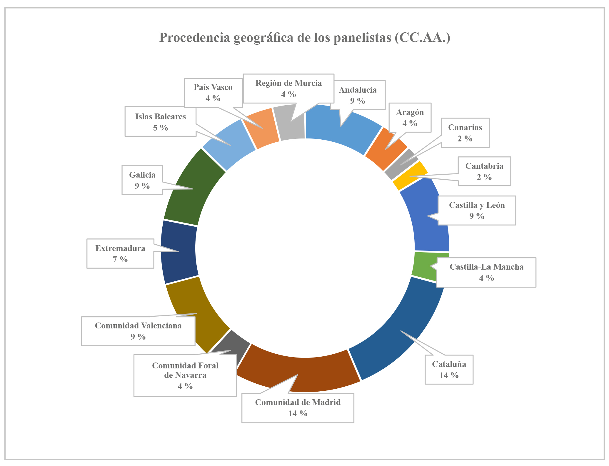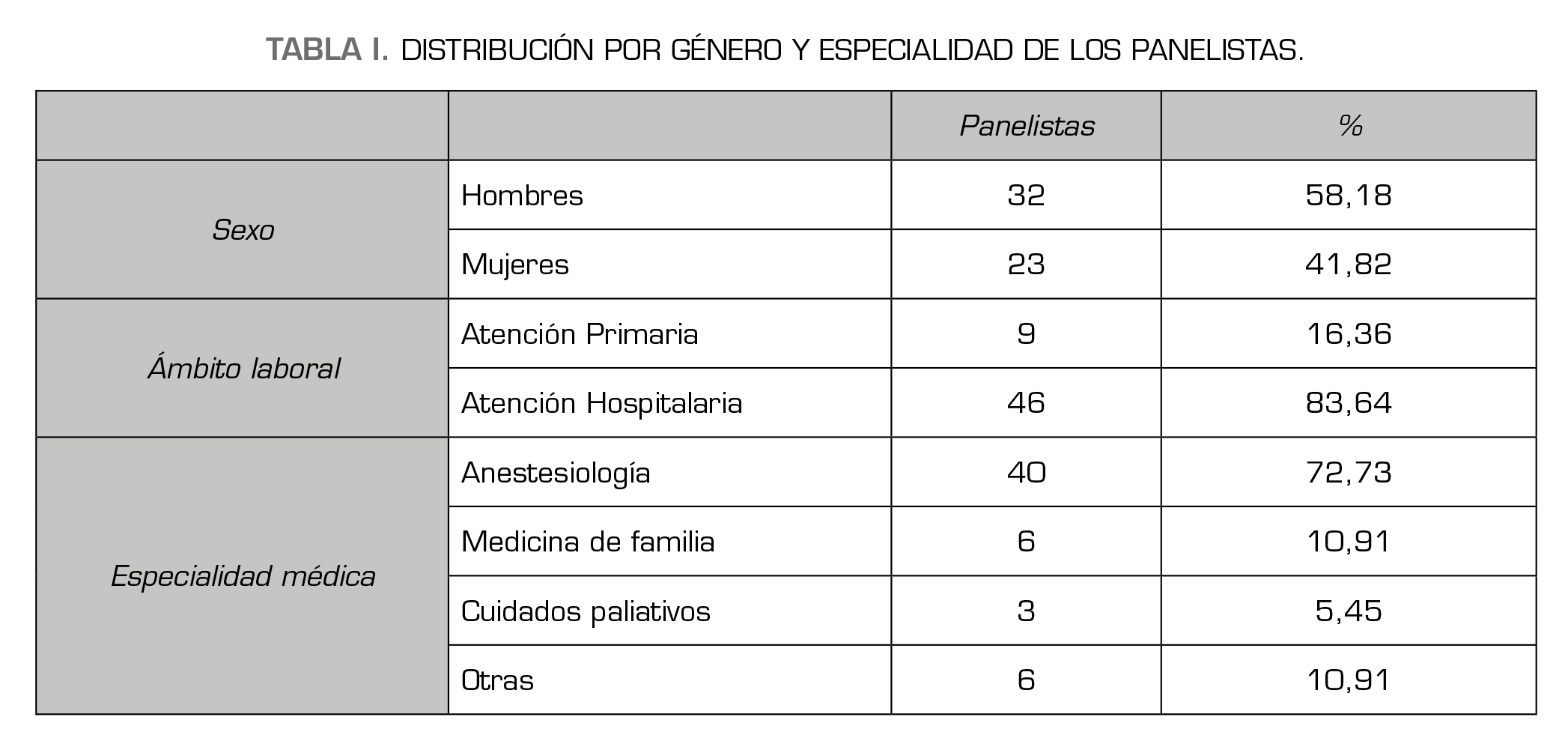 Un total de 93 panelistas respondieron en la primera vuelta, y 55 completaron la encuesta. Los participantes fueron representativos de todo el territorio nacional: un 73 % anestesiólogos, un 11 % médicos de familia, un 5 % paliativistas, un 11 % otra especialidad. Un 84 % ejercía su trabajo en el ámbito hospitalario, frente al 16 % en atención primaria. Además, el 76 % tenía 16 años o más de experiencia en su campo (Figura 2). El 58 % fueron hombres frente al 42 % de mujeres.