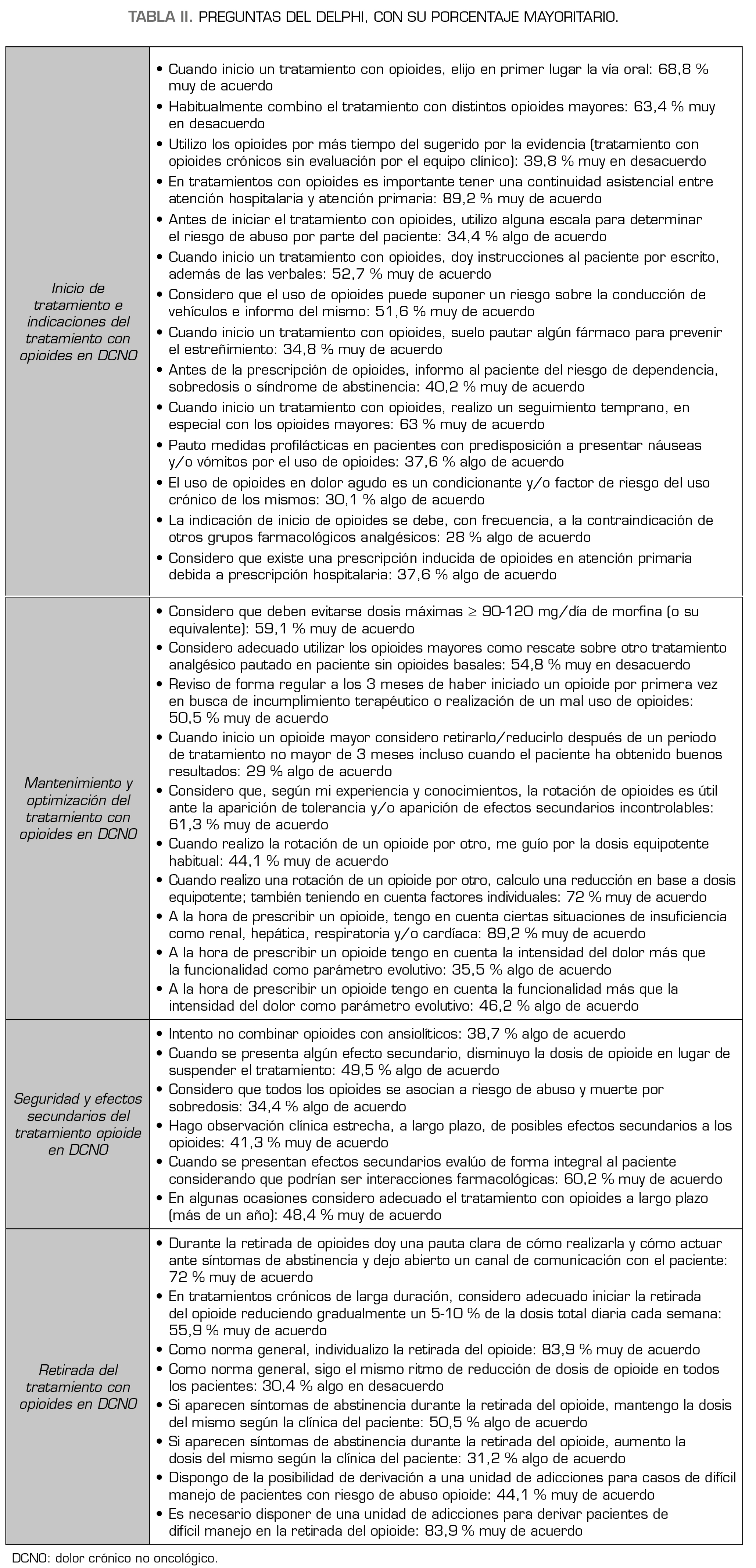 El estudio se realizó entre médicos prescriptores de opioides socios de la Sociedad Española del Dolor (SED), basado en los principios del método Delphi. Los panelistas fueron invitados a contestar varias preguntas preseleccionadas por un grupo de expertos y varios revisores sobre el tratamiento con opioides en el DCNO, en 2 rondas, y se formularon conclusiones y recomendaciones basadas en el consenso alcanzado en cada ítem.
