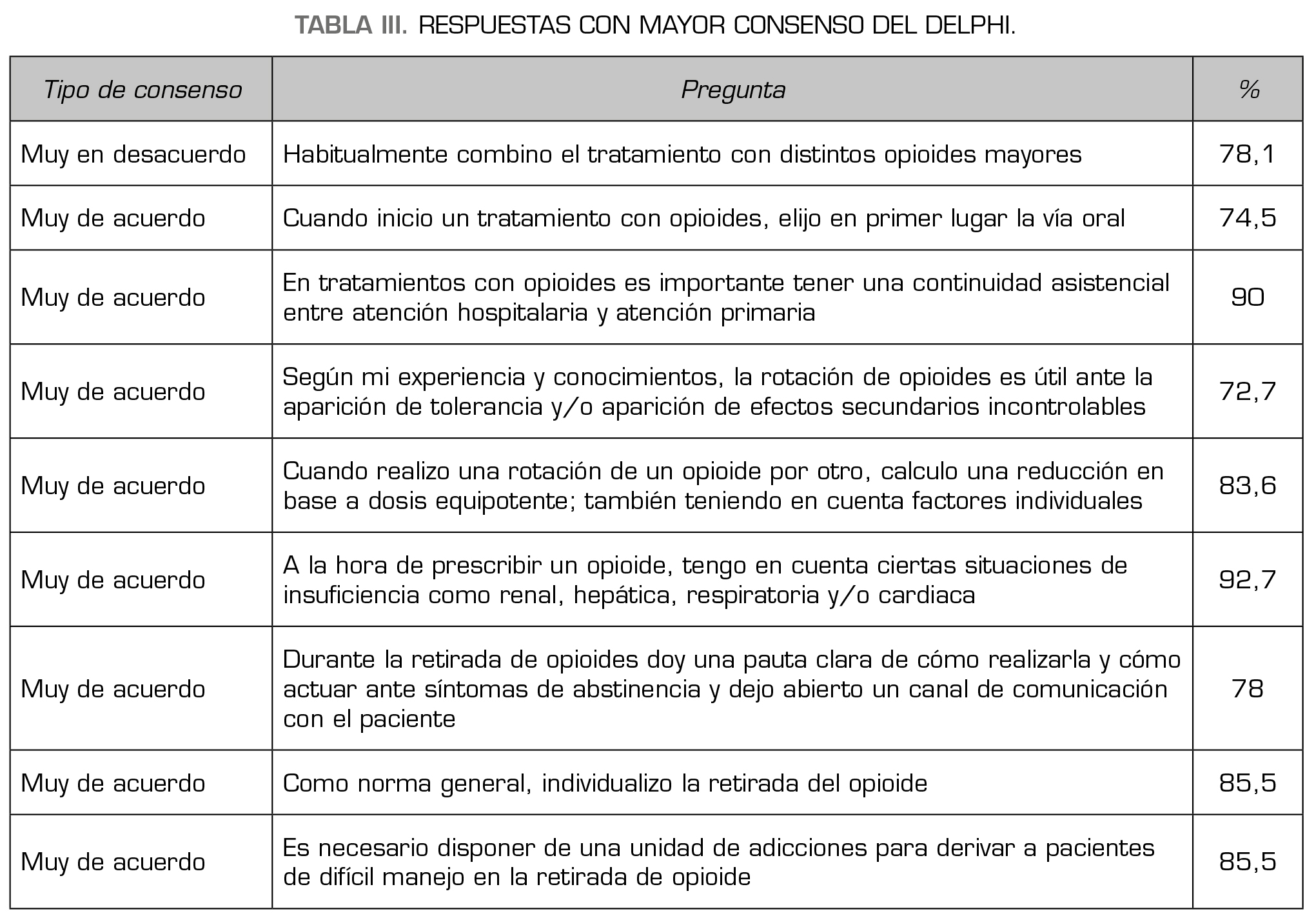 Results: In relation to the beginning of treatment and indications, the panelists strongly agreed that in treatment it is important to have continuity of care between Hospital Care and Primary Care. There was also consensus that we strongly disagreed with combining different major opioids in the same patient. Participants strongly agreed that, when rotating one opioid to another, a dose reduction should be calculated based on the equianalgesic dose, but also taking into account individual factors.
