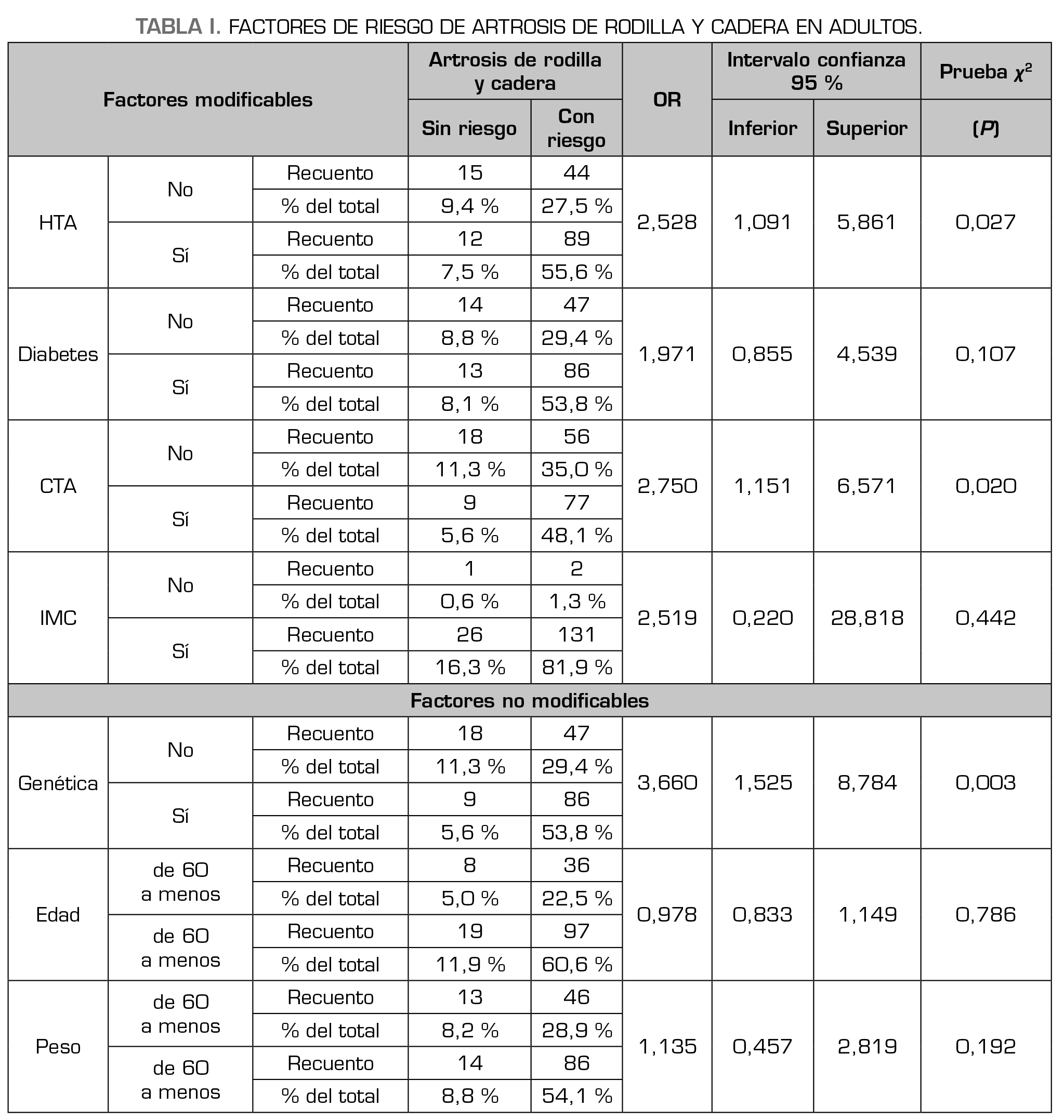 Results: Modifiable factors for the risk of osteoarthritis of the knee and hip are high blood pressure and alcohol and/or tobacco consumption, with double risk in those patients with high blood pressure who consume alcohol and/or tobacco. Likewise, the non-modifiable factor present in the risk of osteoarthritis of the knee and hip in adults is genetics, where the risk is 3 times greater in relation to age and sex.