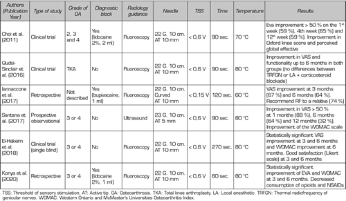 Results: After analyzing five open clinical trials, one cross-sectional study, four prospective observational studies, eight neuroanatomy studies, three retrospective studies, four clinical cases, two case series, three literature reviews and three randomized, double blind, controlled trials; we found genicular nerve radiofrequency achieves a pain reduction and functional improvement with a variable duration, between three and twelve months. There is no consensus regarding the neuroanatomy of the knee joint capsule, the location of the targets, the radiofrequency parameters used and the usefulness of diagnostic blocks.