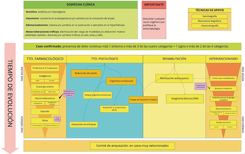 Treatment: Treatment should be early, multimodal and coordinated, with the fundamental objective not only of relieving pain, but also of functionally recovering the affected limb. The cornerstone of treatment is rehabilitation. It should be accompanied by pharmacotherapy and psychological treatment. Within the pharmacotherapy, corticoids (in the most acute phases), bisphosphonates and free-radical scavengers are of special relevance. In advanced stages of the disease, intravenous ketamine is considered as a therapeutic option. Interventional treatments should be considered when the evolution of the syndrome is not optimal, especially sympathetic blocks, in case of predominant sympathetic dysfunction, or neuromodulation, which is the treatment modality with the most scientific evidence.