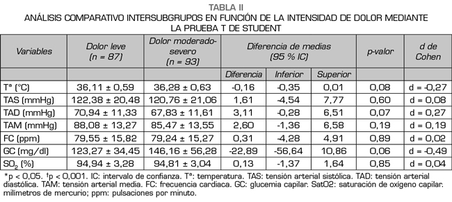 Materials and methods: The present research was a cross-sectional study was carried out in different areas of acute hospitalization in the University Hospital La Paz. Main variable was intensity of pain measured with numeric verbal scale, and secondary variables were vital signs, body temperature, systolic blood pressure, diastolic blood pressure, mean arterial pressure, heart rate, capillary blood glucose and oxygen saturation from the data obtained in the hospital monitoring instruments. The Student's T test was used for comparison between groups. The effect size was measured by the Cohen d and the association size by the Pearson r.