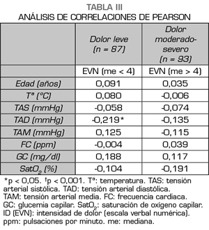 Conclusiones: En base a los resultados obtenidos en el presente estudio, no existen diferencias entre las constantes vitales en función la intensidad de dolor. Las variaciones de las constantes vitales parecen no ser una buena estimación de la intensidad de dolor en pacientes con dolor leve y dolor moderado-severo. Son necesarios análisis prospectivos en muestras de mayor tamaño para confirmar estos resultados.