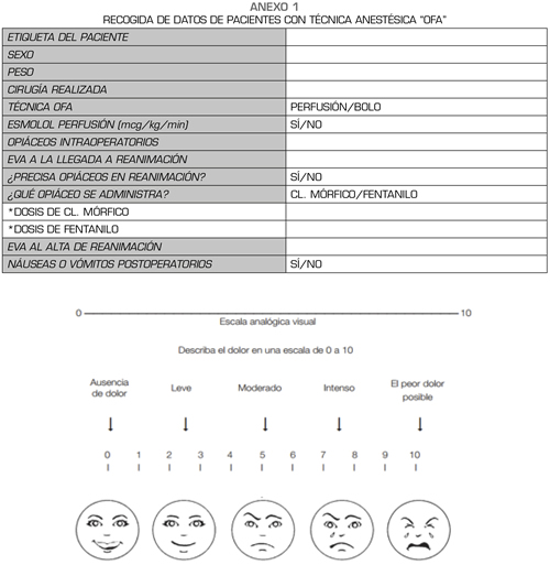 Pacientes y método: Estudio retrospectivo de casos de pacientes sometidos a cirugía mayor en el periodo de noviembre de 2018 a febrero de 2020. Objetivo principal: cuantificar tipo y dosis de opioide administrado en periodo intraoperatorio y en el postoperatorio inmediato. Objetivos secundarios: graduación del dolor en el postoperatorio y al alta a planta de hospitalización y presencia de náuseas/vómitos en el postoperatorio Resultados: 157 pacientes fueron incluidos. El 29,9 % de los pacientes no precisaron ninguna dosis de opioide intraoperatorio. De los que sí la precisaron, un 72,7 % de los mismos solo necesitó morfina y a una dosis media de 3,3 mg (± 0,9); un 8,1 % solo recibieron fentanilo (dosis media de 110,1 mcg, ± 57,1), y un 19,2 % recibieron morfina y fentanilo (3,8 mg ± 1,2 y 90,4 mcg ± 62,4, respectivamente). En cuanto a la necesidad de opioide postoperatorio, solo el 31,7 % de los pacientes precisó su administración; de ellos ⅔ (33 pacientes) solo recibieron morfina (4,8 mg ± 2,6), 1/5 (10 pacientes) solo fentanilo (83,3 mcg ± 28,8) y el resto una combinación de fentanilo y morfina (140,6 mcg ± 119,4 y 8 mg ± 5,9, respectivamente). Respecto a la intensidad de dolor, el valor en la escala EVA a la llegada de los pacientes a la Reanimación tuvo un valor de 1,6 ± 1,9 y al alta de 0,3 ± 0,6. Solo dos pacientes tuvieron náuseas o vómitos.