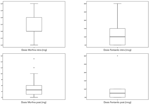 Results: 157 patients were recruited. 29,9 % need no opioid intraoperatively. Those who requiered it, 72,7 % only needed morphine (3,3 mg ± 0,9), 8,1 % had to recieved fentanyl (110,1 mcg, ± 57,1) and 19,2 % need both morphine and fentanyl (3,8 mg ± 1,2 and 90,4 mcg ± 62,4). At the postoperative recovery unit, only 31,7 % precised opioids: ⅔ (33 patients) recieved morphine (4,8 mg ± 2,6), 1/5 (10 patients) only fentanyl (83,3 mcg ± 28,8) and the rest needed a combination of fentanyl and morphine (140,6 mcg ± 119,4 and 8 mg ± 5,9, respectively). Two of them have nausea or vomyting.