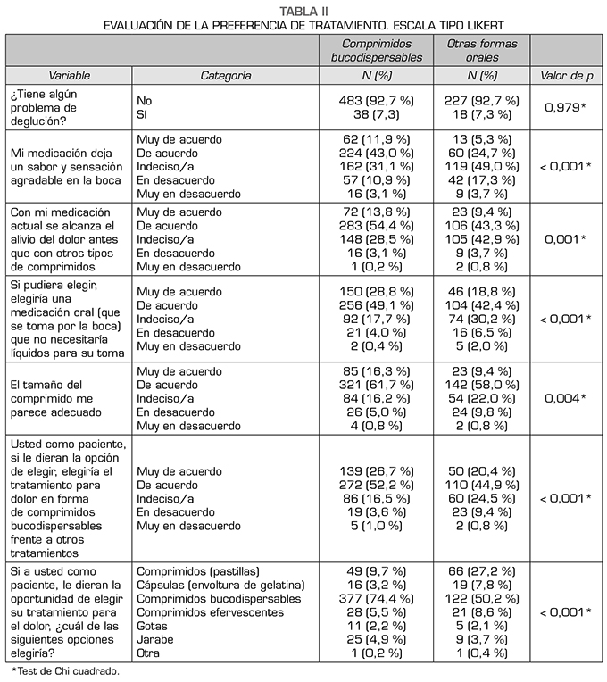 Resultados: Se evaluaron 835 pacientes. No se observaron diferencias estadísticamente significativas en el perfil clínico y sociodemográfico de los pacientes entre ambos grupos de tratamiento, pero sí entre los pacientes en tratamiento con Paxiflas®, en relación con la evaluación de la satisfacción, tanto en la puntuación total (p = 0,002) como en las dimensiones: la interferencia de los efectos secundarios de la medicación en las actividades cotidianas (p = 0,006), la comodidad de uso (p < 0,001) y la opinión general respecto a la medicación y su estado de salud (p = 0,010). Además, la preferencia de los pacientes por el tratamiento con Paxiflas® fue estadísticamente significativas (p < 0,001) en comparación con otras combinaciones orales de tramadol HCI (37,5 mg) y paracetamol (325 mg), incluyendo la percepción de rapidez en el alivio del dolor, comodidad de la medicación, sabor y sensación agradable, conveniencia del tamaño del comprimido, y elección final del tratamiento.