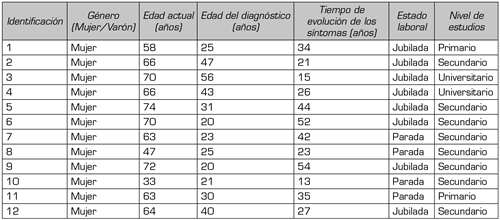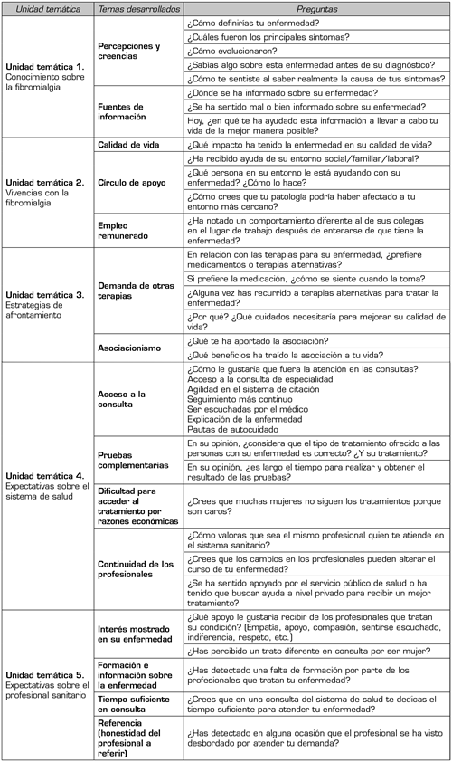 Material y métodos: Se realizó un estudio cualitativo basado en una discusión de grupo focal. Los pacientes fueron identificados y reclutados en la sede de la Asociación de Fibromialgia y Fatiga Crónica de Tenerife (AFITEN) a través de un muestreo no probabilístico de tipo intencional de acuerdo con los siguientes criterios de inclusión: 1) mujeres usuarias de la asociación, 2) mayores de 18 años, 3) diagnosticadas con FM, 4) sin vinculación terapéutica, de parentesco y/o amistad con el personal investigador, 5) que comprendieran y hablaran fluidamente el español y 6) que dieran su consentimiento escrito para participar. Se llevó a cabo un análisis temático sobre las respuestas preguntas abiertas dirigidas a explorar las unidades temáticas: 1) conocimientos sobre la FM, 2) vivencias con la FM, 3) estrategias de afrontamiento, 4) expectativas sobre el sistema de salud y 5) expectativas sobre el profesional sanitario. Así, la muestra resultante fue de 12 mujeres con una edad promedio de 62,2 años (DE = 11,6). La edad media del diagnóstico fue de 31,8 años (DE = 12,0) mientras que el tiempo de evolución de los síntomas fue de 32,2 años (DE = 13,7).