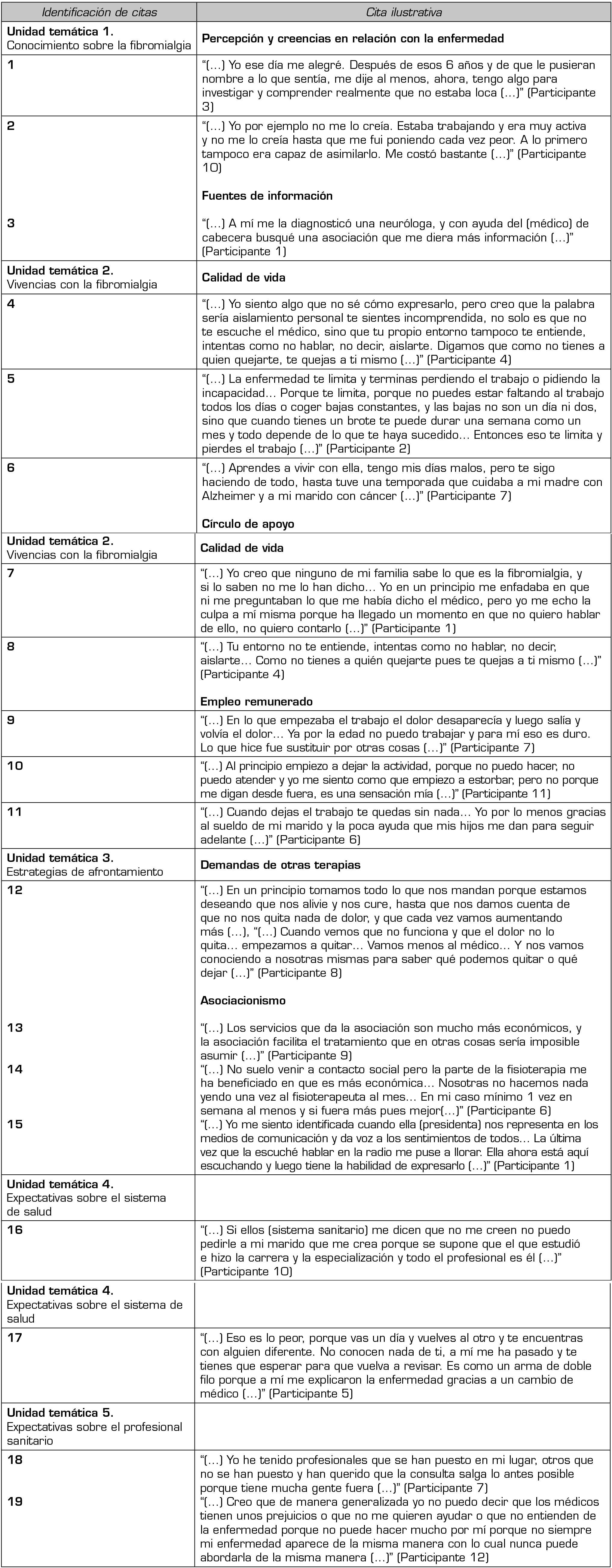Material and methods: A qualitative study based on a focus group discussion was conducted. The patients were identified and recruited at the Association of Fibromyalgia and Chronic Fatigue of Tenerife (AFITEN) through an intentional non-probabilistic sampling according to the following inclusion criteria: 1) female users of the association, 2) over 18 years of age, 3) diagnosed with FM, 4) without therapeutic ties, kinship and/or friendship with the research staff, 5) who understood and spoke Spanish fluently, and 6) who gave their written consent to participate. A thematic analysis was carried out on the answers to open questions aimed at exploring the thematic units: 1) knowledge about FM, 2) experiences with FM, 3) coping strategies, 4) expectations about the management of health system and 5) expectations about the health professional. 12 women with a mean age of 62.2 years (SD = 11.6) were included. The mean age of diagnosis was 31.8 years (SD = 12.0) while the duration of symptoms was 32.2 years (SD = 13.7).