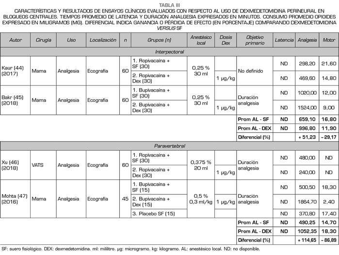 Introducción: Dexmedetomidina (DEX) es un fármaco multifunción propuesto en los últimos años como coadyuvante para bloqueos regionales con anestésico local (AL). Objetivos: evaluar las propiedades analgésicas de este α-2 agonista al adicionarse a AL en diferentes abordajes de bloqueo de nervio periférico (anestesia regional), en términos de calidad de la analgesia obtenida y potenciales complicaciones asociadas. Materiales y Métodos: Se llevó a cabo una revisión narrativa, utilizando términos MeSH (inglés-español), con motores de búsqueda ampliamente conocidos (PUBMED, EMBASE, COCHRANE y LILACS), considerando últimos 5 años a la fecha (entre otros filtros), analizando revisiones sistemáticas, meta-análisis o ensayos clínicos que comparasen bloqueos regionales con AL de larga duración con/sin DEX perineural. Resultados: En líneas generales, al utilizar este α-2 agonista selectivo, la latencia del bloqueo disminuyó -19.16%, aumentó la duración de la analgesia +60.79% y bloqueo motor +54.71%; reduciendo además consumo de opioides -49.54% y anestésicos locales -52.00%, lo cual se explicaría por un mecanismo de acción intrínseco a nivel perineural. Su asociación a depresión cardiovascular y sedación (ambas transitorias, reversibles y sin mayor repercusión clínica) es dosis-dependiente, recomendándose 0.5-1µg/kg perineural (máximo 100µg). Conclusiones: En términos de riesgo-beneficio, DEX perineural mejora la calidad de la analgesia obtenida con mínimos efectos adversos asociados.