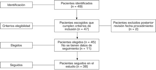 Results: 45 patients were identified; of these, 11 did not present follow-up data. 93 % (n = 35) of the patients presented a VAS (visual analogue pain scale) greater than 7 prior to the procedure, 28 % (n = 11) presented immediate post-block pain improvement with a VAS less than 6, 57 % at the first control (n = 22) maintained the improvement achieved, and 10 % (n = 4) returned to their baseline state of pain. In the second, 10 % (n = 4) of the patients did not show changes in intensity, and 78.9 % (n = 30) maintained improvement in pain intensity.