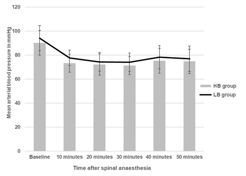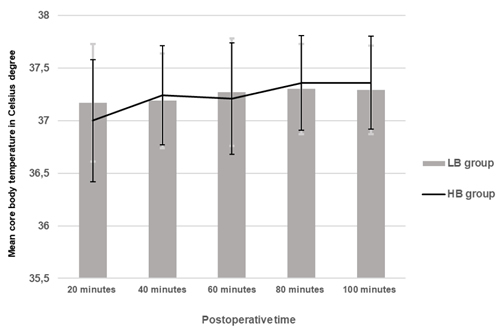 Resultados: El nivel de bloqueo espinal fue mayor en el grupo HB en comparación con el grupo LB (p = 0,02). La incidencia de escalofríos intraoperatorios fue de 15 (30 %) en el grupo HB y de 10 (20 %) en el grupo LB (p = 0,032), mientras que las puntuaciones de escalofríos no fueron significativas. La incidencia de escalofríos postoperatorios fue de 16 (32 %) en el grupo HB y de11 (22 %) en el grupo LB (p = 0,043). Las temperaturas intraoperatorias de la membrana timpánica mostraron una reducción muy significativa con respecto a la línea de base (p < 0,0001), mientras que los valores postoperatorios no mostraron diferencias significativas con respecto a la línea de base.