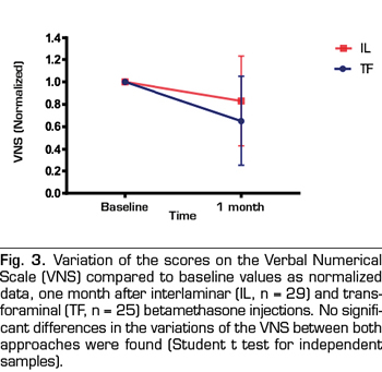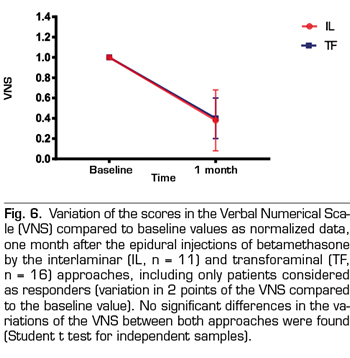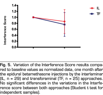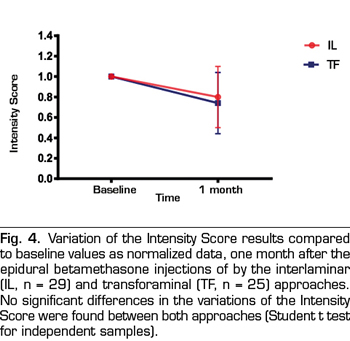 Results: Fifty four patients were treated with epidural betamethasone. In 29 the parasagittal interlaminar route was utilized while 25 were treated by the transforaminal route. A 20 % reduction in baseline VNS was observed with the interlaminar route and 36 % reduction with transforaminal approach. Intensity and Interference Scores were also reduced. This reductions were statistically significant when comparing to baseline data (paired t test) but differences between groups were not significant (unpaired t test). However the number of positive responses as defined above was greater in the transforaminal group, 64 % versus 38 % in the interlaminar group, statistically signifi cant difference using the Chi Square analysis (p=0.01). In patients with positive responses, interlaminar and transforaminal betamethasone produce clinical and statistically significant reductions in pain intensity and interference, without difference between groups.
