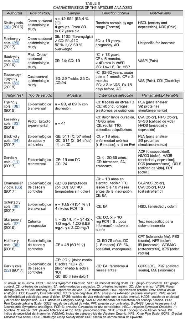 Results: 13 articles were selected after applying inclusion and exclusion criteria. All publications were observational studies. Proinflammatory cytokine values were compared in patients with chronic pain, taking into account insomnia, pain tolerance, catastrophism, gender and body mass index.