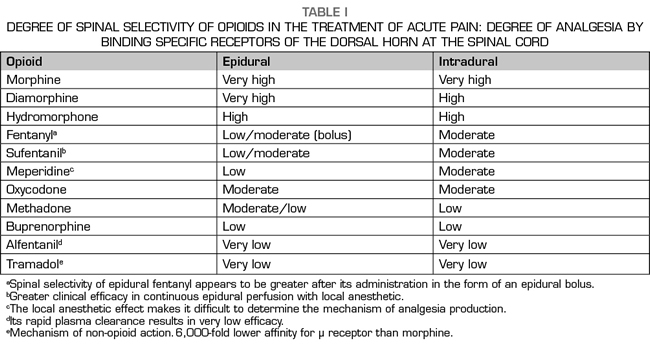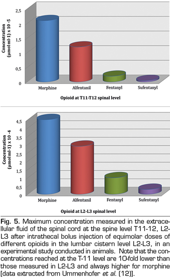 Although there is no either ideal analgesic or route of neuraxial administration, clinicians alike continue to search for compounds with qualities which may approach this idea. However, it´s a demonstrated fact that spinal administration of an opioid drug does not always guarantee segmental and selective analgesia into the spinal cord. This point is valid due to partial reuptake of the drug to systemic blood circulation reaching specific brain opioid receptors, rather than the differences are explained by variations in the clearance rate from the cerebrospinal fluid. Published evidence from either human or animal experimental studies indicates that bioavailability in the spinal cord biophase is negatively correlated with liposolubility. Therefore, opioid spinal cord bioavailability is higher for hydrophilic opioids like morphine, than for lipophilic ones such as fentanyl, sufentanil or alfentanil.
