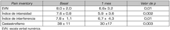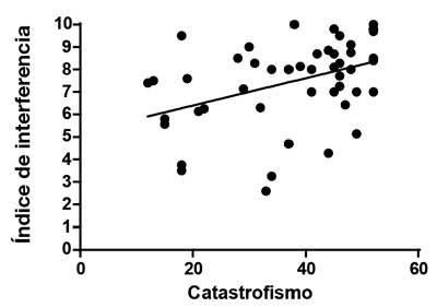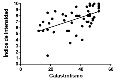Resultados: El catastrofismo total fue mayor en mujeres que en hombres. Se encontró una correlación lineal positiva moderada entre catastrofismo, intensidad del dolor e índice de interferencia, estadísticamente significativa. En los 39 pacientes tratados, se encontró una disminución estadísticamente significativa de la intensidad, interferencia funcional del dolor y catastrofismo total. Dieciseis pacientes se consideraron respondedores. En estos, el índice de intensidad disminuyó de 7,8 ± 0,8 a 3,9 ± 3,1 (50 % de porcentaje de cambio, p = 0,0001); la interferencia funcional del dolor evaluada por el índice de interferencia disminuyó de 8,2 ± 1,6 a 5,0 ± 3,8 (40 % de cambio, p = 0,0027) y el catastrofismo total disminuyó de 37 ± 13 a 17,5 ± 16 (57 % de cambio, p < 0,0001). El catastrofismo total previo no mostró diferencias entre los pacientes respondedores y no respondedores a las inyecciones epidurales de esteroides.
