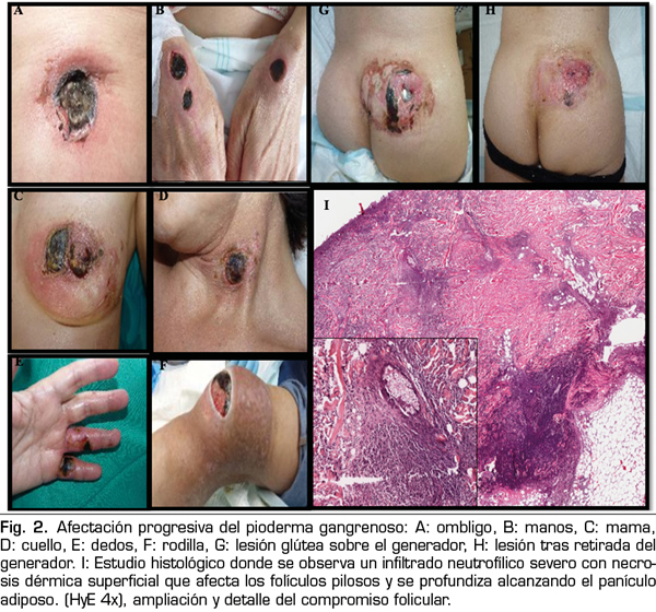 Presentamos un paciente con un síndrome de dolor regional complejo posquirúrgico en ambos pies que desarrolla una lesión necrótica, pustulosa, eritematosa y dolorosa después del implante de un sistema de neuroestimulación medular que se diagnosticó como PG y se trató correctamente gracias a un enfoque multidisciplinario.
