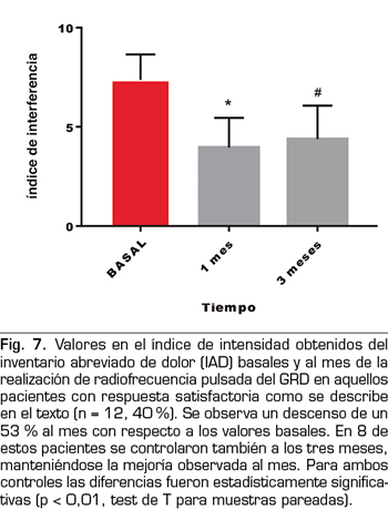 Resultados: La EVN se redujo de 7,7 ± 2,2 a 5,9 ± 3 (p < 0,01). Los índices de intensidad e interferencia disminuyeron de 7,1 ± 1,5 a 5,9 ± 2,1 (p < 0,01) y 7,1 ± 1,9 a 6,0 ± 2,3 (p < 0,02) respectivamente. 12 de los 30 pacientes (40 %) presentaron una respuesta analgésica satisfactoria. En estos, la EVN disminuyó de 8,0 ± 1,5 a 3,8 ± 2,6 y los índices de intensidad e interferencia de 7,4 ± 1,3 a 3,9 ± 1,5 (p < 0,0001) y 7,7 ± 1,9 a 4,9 ± 2,7 (p = 0,002), respectivamente.