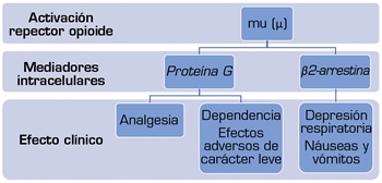 Fig. 1. Activación del receptor opioide mu (μ) y de las vías intracelulares tanto de la analgesia como de los efectos adversos (15,16).