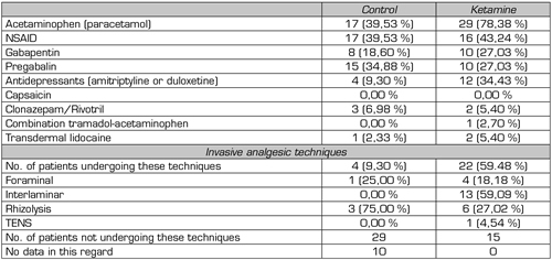 Material and methods: Following the recommendations of the American Pain Society (APS), a new intra and postoperative analgesic protocol based on the use of ketamine was designed in 2018. Intraoperatively, a bolus of 0.5 mg/kg of ketamine was administered, followed by a dose infusion of 0.2 mg/kg/h until the surgical wound was closed. During the first 48 postoperative hours, a patient-controlled analgesia pump (PCA) of morphine-ketamine was maintained along with a multimodal analgesia regimen with paracetamol and dexketoprofen. An effectiveness analysis comparing the new protocol (ketamine group) with the previous one (control group), based on the use of tramadol 100 mg / 6h or PCA morphine, was done. During the first 48 postoperative hours, NVS records, need of rescue analgesia, morphine bolus or continuous morphine infusion (control group) or ketamine morphine infusion (ketamine group) were analyzed.