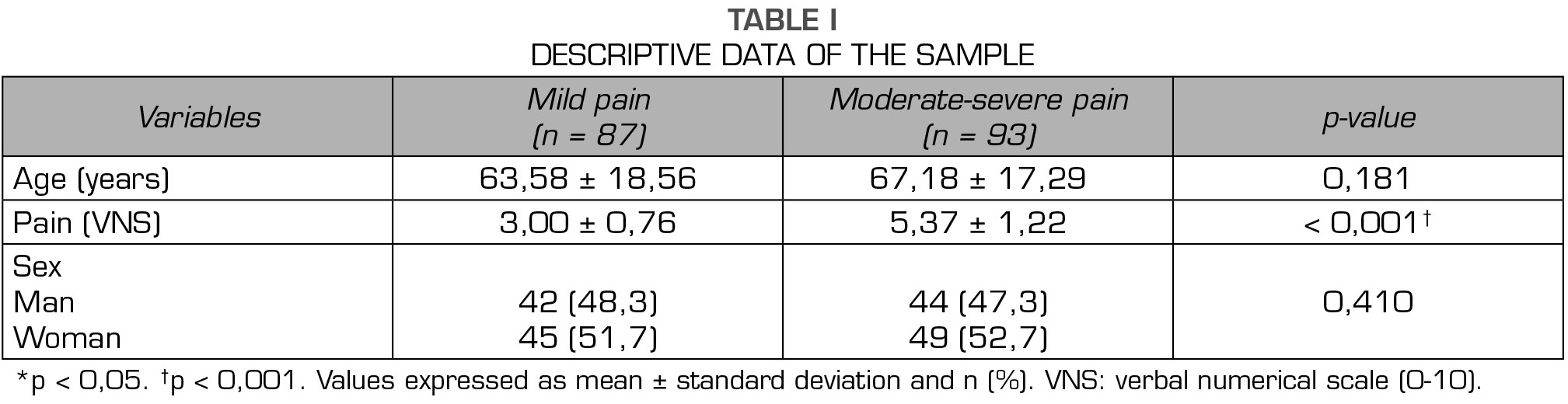 Conclusiones: En base a los resultados obtenidos en el presente estudio, no existen diferencias entre las constantes vitales en función la intensidad de dolor. Las variaciones de las constantes vitales parecen no ser una buena estimación de la intensidad de dolor en pacientes con dolor leve y dolor moderado-severo. Son necesarios análisis prospectivos en muestras de mayor tamaño para confirmar estos resultados.