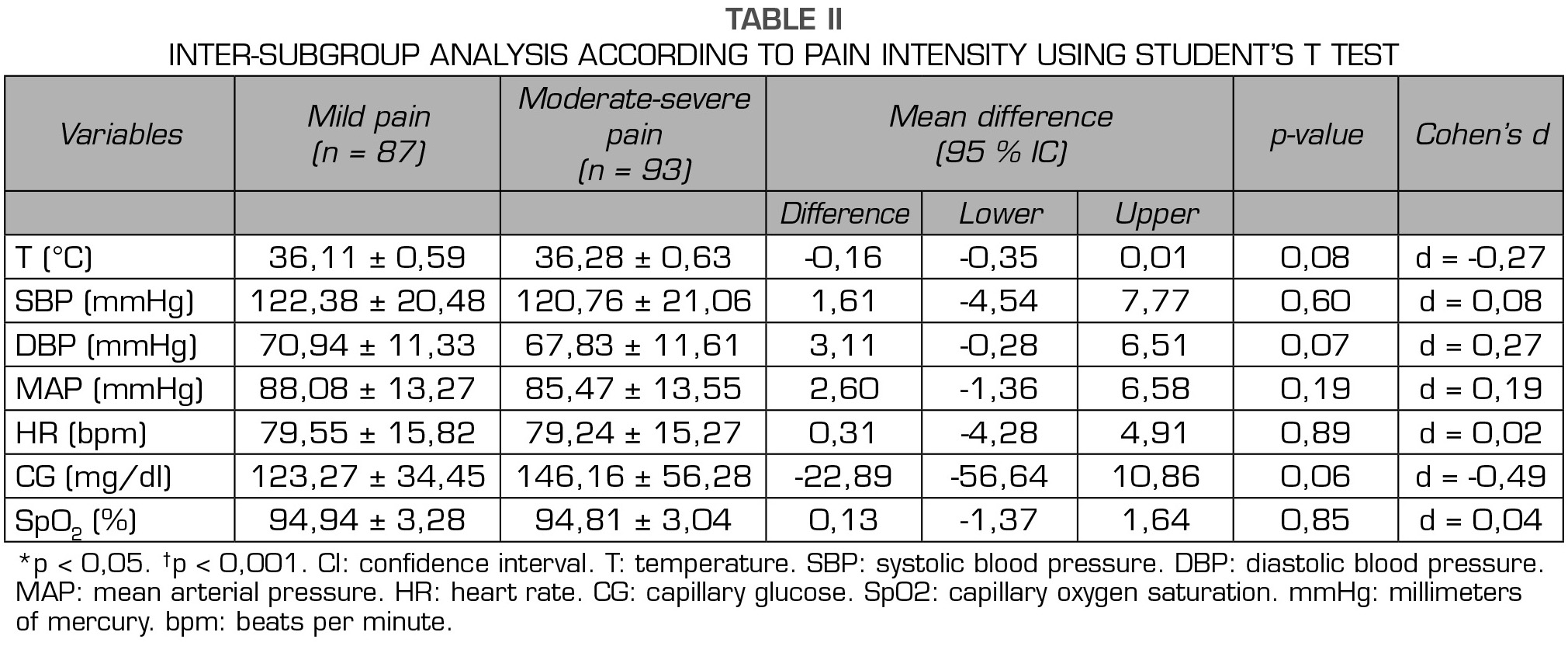 Materials and methods: The present research was a cross-sectional study was carried out in different areas of acute hospitalization in the University Hospital La Paz. Main variable was intensity of pain measured with numeric verbal scale, and secondary variables were vital signs, body temperature, systolic blood pressure, diastolic blood pressure, mean arterial pressure, heart rate, capillary blood glucose and oxygen saturation from the data obtained in the hospital monitoring instruments. The Student's T test was used for comparison between groups. The effect size was measured by the Cohen d and the association size by the Pearson r.