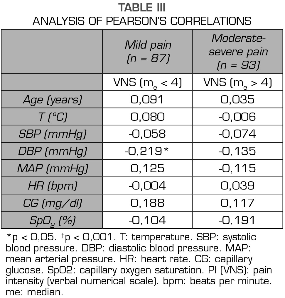 Conclusions: Our results suggest that there are no differences between the vital signs according to the pain intensity and there are not associations between them.