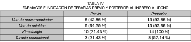 La descripción de tratamiento farmacológico y terapéutico previo y posterior al ingreso se muestra en la Tabla IV. Además, el 48,86 % ingresó a terapias complementarias y solo tres pacientes (21,43 %) confirmaron tabaquismo activo.