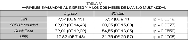 Las variables EVA, CGDC intensidad, Quick DASH y LEFS presentaron distribución normal, por lo que se realizó un análisis t-test para comparar estas variables pre y postratamiento, resultados que se muestran en la Tabla V. Para las variables intensidad del dolor, la EVA mostró una reducción de 2,2 cm con una DS de 2,1