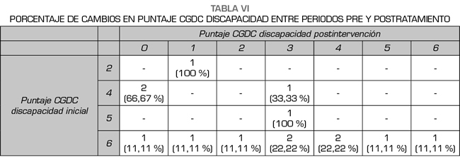 Los resultados de las variables CGDC discapacidad y grado de CGDC pre y postratamiento se describen en las Tablas VI y VII.