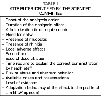 Methods: A Scientific Committee performed a classification of 14 relevant attributes in the prescription of transmucosal fentanyl for BTCP. Subsequently, a dossier of scientific evidence was generated comparing these 14 attributes among the different available transmucosal fentanyl formulations, which was shared with the panel of experts (115 Medical Oncologists). After a thorough review of the document, the participants carried out an online vote for the prioritization of the attributes.