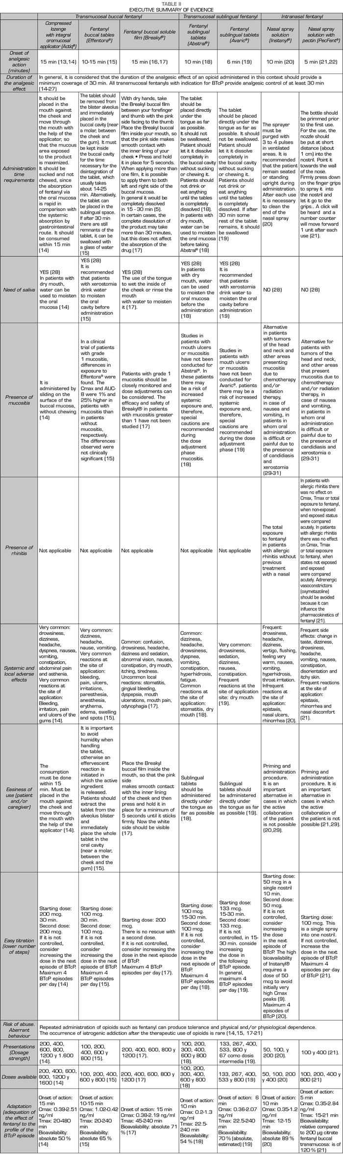 Results: Out of fourteen attributes analyzed, seven achieved a consensus of ≥ 50 % of the participants: the start of the analgesic action (84 %), the adequacy of the effect of fentanyl to the BTCP episode (72 %), the ease of use (58 %), the presence of mucositis (57 %),