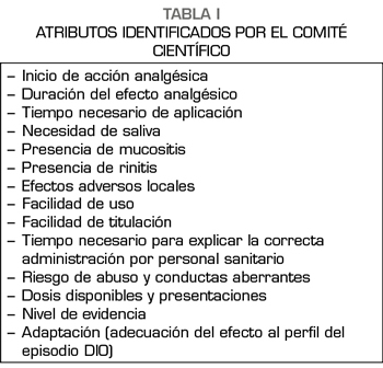 Resultados: De catorce atributos analizados, siete consiguieron un consenso de ≥ 50 % de los participantes: el inicio de la acción analgésica (84 %), la adecuación del efecto del fentanilo al perfil del episodio de DIO (72 %), la facilidad de uso por los pacientes y cuidadores (69 %), la duración del efecto (58 %), la presencia de mucositis (57 %),