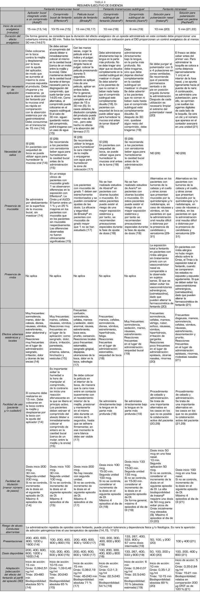 de los episodios tiene una duración inferior a los 30 minutos. De las formulaciones de fentanilo disponibles en la actualidad, el fentanilo intranasal con pectina proporciona un inicio de analgesia más rápido: 5 minutos tras la administración (25). Los fentanilos transmucosos de administración oral o sublingual tienen tiempos de analgesia superiores, llegando en algunos casos hasta a los 15 minutos (11). Por otro lado, las formas orales de liberación inmediata de morfina u oxicodona muestran su efecto analgésico aproximadamente a los 30-40 minutos de su administración oral, siendo claramente insuficientes para controlar adecuadamente el DIO. A pesar de ello, una encuesta reciente mostró que estos se administran aún de forma generalizada (hasta en el 98 % de los pacientes) en algunos países del norte del Europa (32). En un estudio de 1000 pacientes con cáncer de 13 países europeos, se mostró que tan solo el 19 % de los pacientes recibían fentanilo transmucoso para el tratamiento del DIO (33).