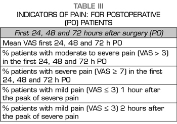 Considering that the most intense post-surgical pain does not occur only during the first 24 hours, but also between 48 and 72 hours, which is when the postoperative patient intensifies mobilization, respiratory physiotherapy, rehabilitation, etc., indicators were established throughout this period. The results of these indicators of acute postoperative pain have allowed us to reassess the protocols of analgesic regimen, especially in those fast-track surgeries where analgesic optimization at early discharge is critical.