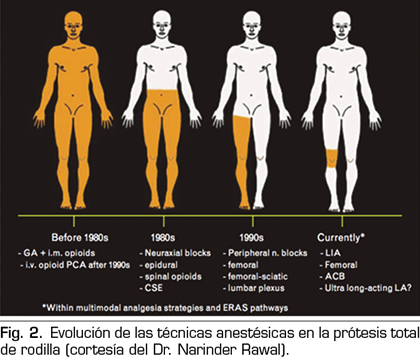 La anestesia regional y la cirugía mínimamente invasiva han permitido una evolución hacia la “localización específica de la zona a analgesiar” durante la cirugía. Por ejemplo, en el caso de la prótesis total de rodilla (Figura 2).
